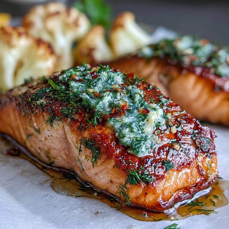 Save There's something almost meditative about watching salmon turn from translucent to opaque under the oven's warmth, especially when you've crowned it with herb butter that smells like a Mediterranean garden. I stumbled onto this version on a Tuesday evening when I had four salmon fillets and absolutely no creative energy, so I grabbed whatever fresh herbs were lurking in my fridge and let them do the talking. The cauliflower became golden while the salmon stayed buttery and tender, and suddenly what felt like the easiest dinner became the meal everyone requested again and again.