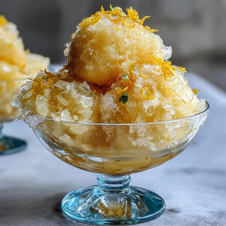 Serve this elegant sorbet in chilled glasses or bowls to maintain its perfect frozen consistency. Garnish with fresh mint leaves for a pop of color and complementary freshness, or add a twist of lemon zest for extra citrus aroma. This sorbet pairs beautifully with almond biscotti for textural contrast—the crunchy cookies are perfect for dipping. It also makes an exceptional palate cleanser when served in small portions between courses during a formal dinner. For a sophisticated presentation, serve in hollowed-out lemon halves or elegant coupe glasses.