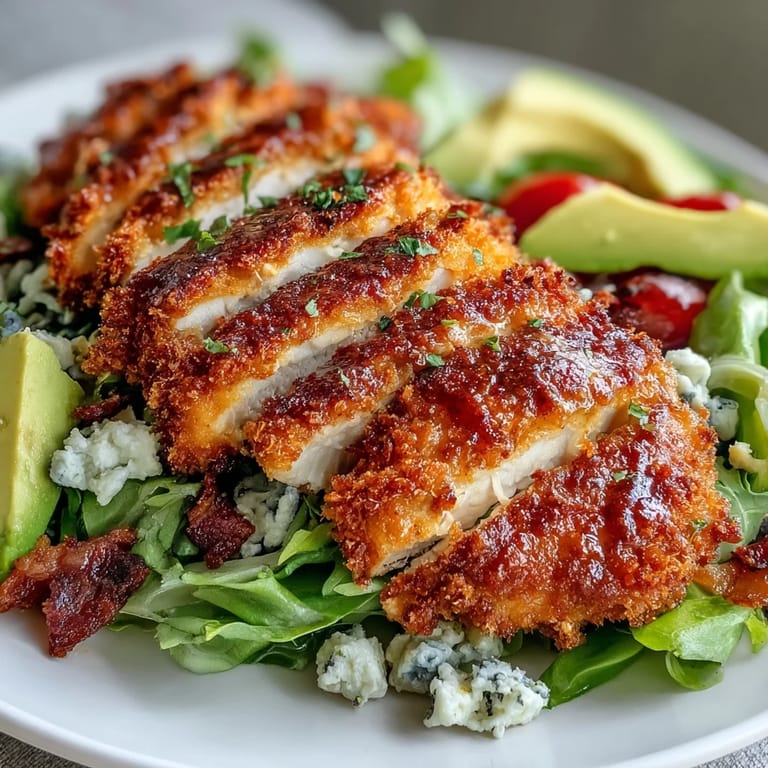 Save My neighbor showed up one afternoon with a bag of beautiful avocados from her tree, and I suddenly had the urge to build something substantial on a bed of greens. That's when this Parmesan-crusted chicken Cobb salad came together—crispy, golden chicken thighs meeting every vegetable I could arrange in neat little rows. It felt like the kind of salad you'd order at a fancy lunch spot, except it was happening in my kitchen with afternoon light streaming through the window. The crunch of that Parmesan crust against the cool, fresh vegetables was exactly what I didn't know I was craving.