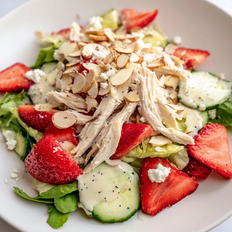 Save Last summer my neighbor dropped off a basket of strawberries from her garden and I stood there staring at them knowing they deserved better than just becoming shortcake topping. The humidity was hanging thick in the air and something about those jewel-red fruits made me crave something crisp and cool that would still feel like a proper meal. I ended up throwing together this salad on a whim and my husband took one bite and asked why I hadn't been making this for years.