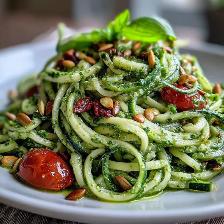 - Toss the zucchini noodles gently with your pumpkin seed pesto until everything is coated, then plate immediately while the noodles are still slightly warm. Top with halved cherry tomatoes and torn fresh basil leaves right before serving so they stay vibrant.